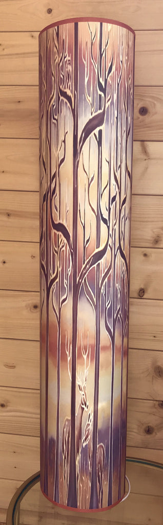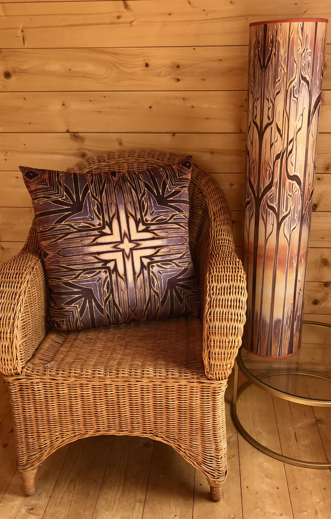 A stunning statement piece 1m tall free standing lamp featuring my Deco Trees Design from my hand painted silk originals. I have repeated the design to perfectly fit this lamp. With gentle warming colours of caramel, terracotta, cream, soft grey and mauve it is a beautiful piece to create a wonderful atmosphere.