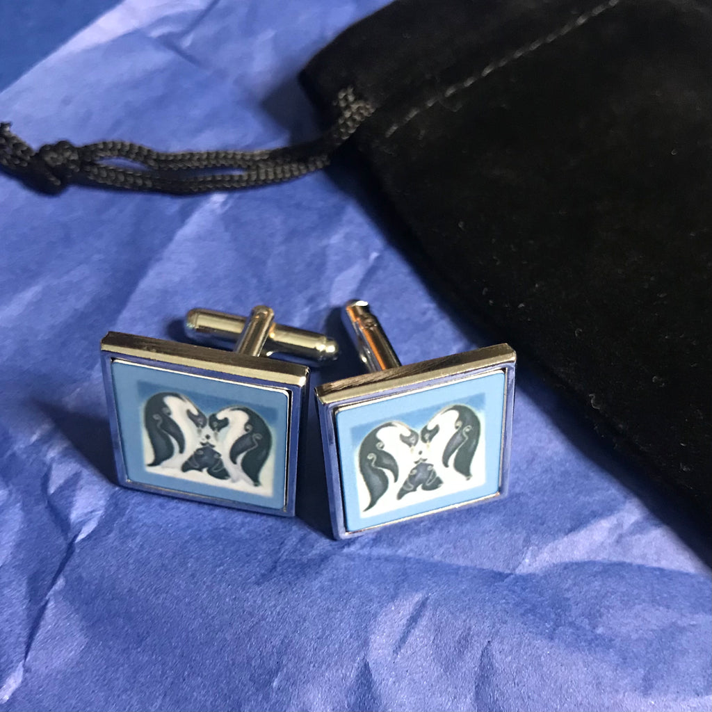 The design was originally hand painted on silk. Here I have printed it onto an aluminium square and set it into these metal cuff links.