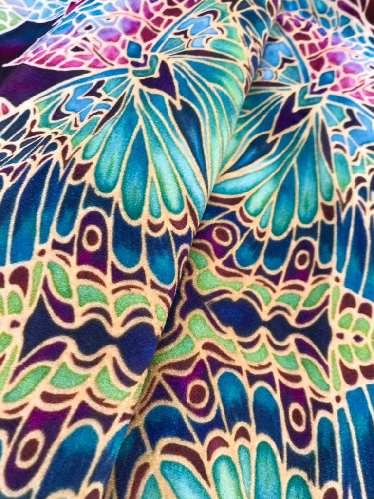 Butterfly repeat in mossy green, gold, purple and plum.
