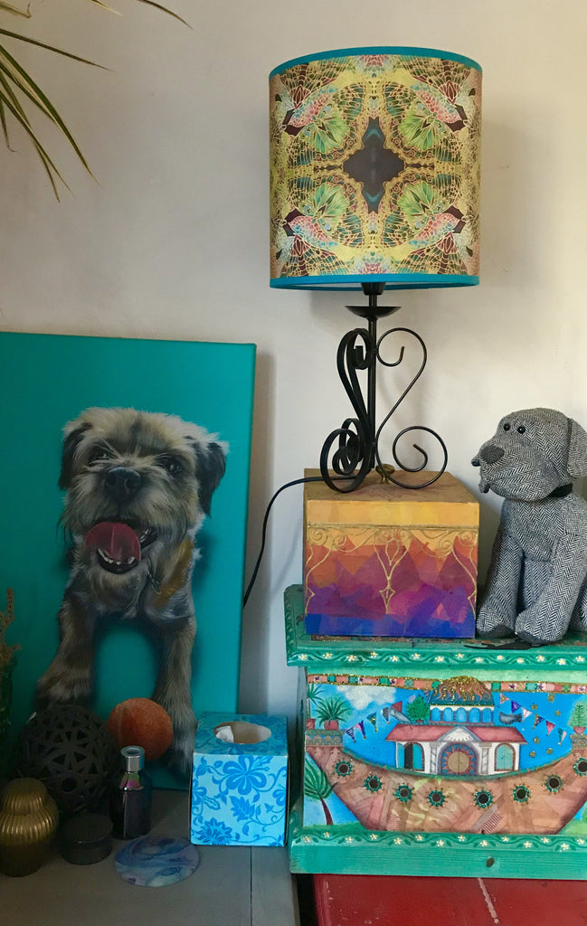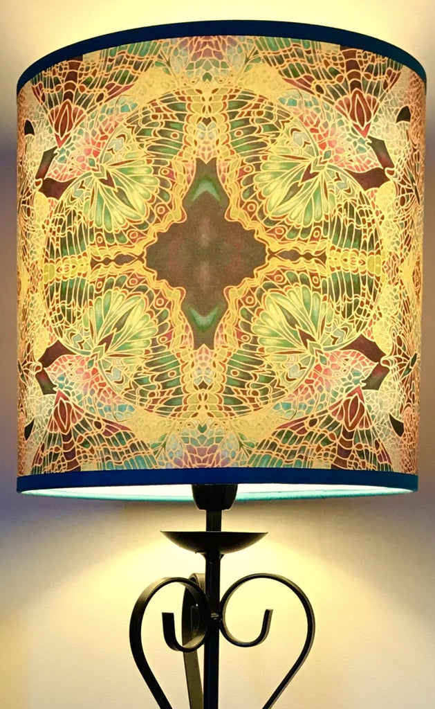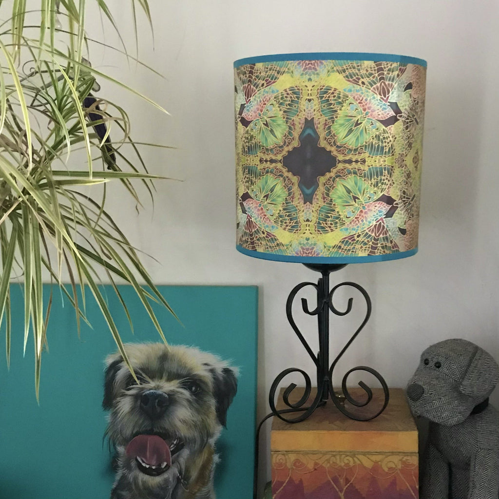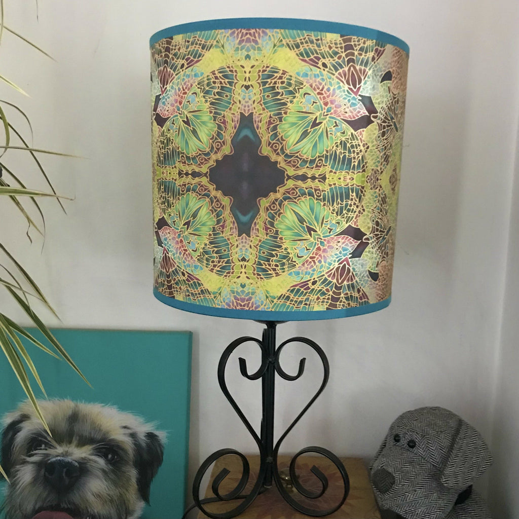 Beautiful enlivening light emits from this dramatic detailed drum lamp shade. The design is If butterflies Intricately repeat patterned in beautiful stain glass colours. Printed from my hand painted silk original, pictured is a Drum Shaped Lampshade.
